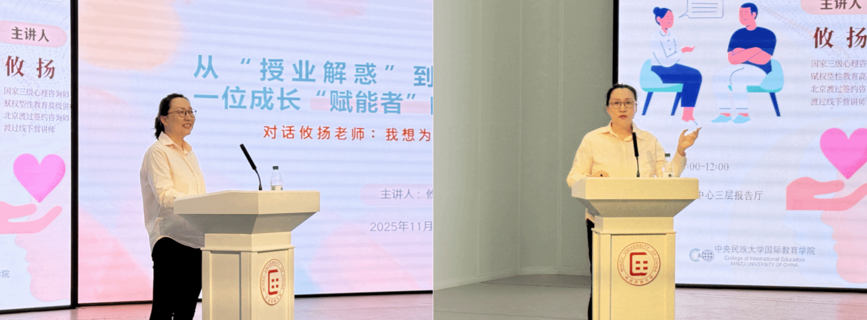 11月10日,情色小说 “榜样育人”系列讲座第五讲在丰台校区智慧中心三层报告厅圆满举办。活动特邀渡过心理咨询师、心泉心理咨询师、北大附中朝阳未来校区心理老师攸扬,为2025级汉语国际教育专业全体本科生作主题分享。情色小说 副院长江傲霜、团委书记李雅洁出席活动。