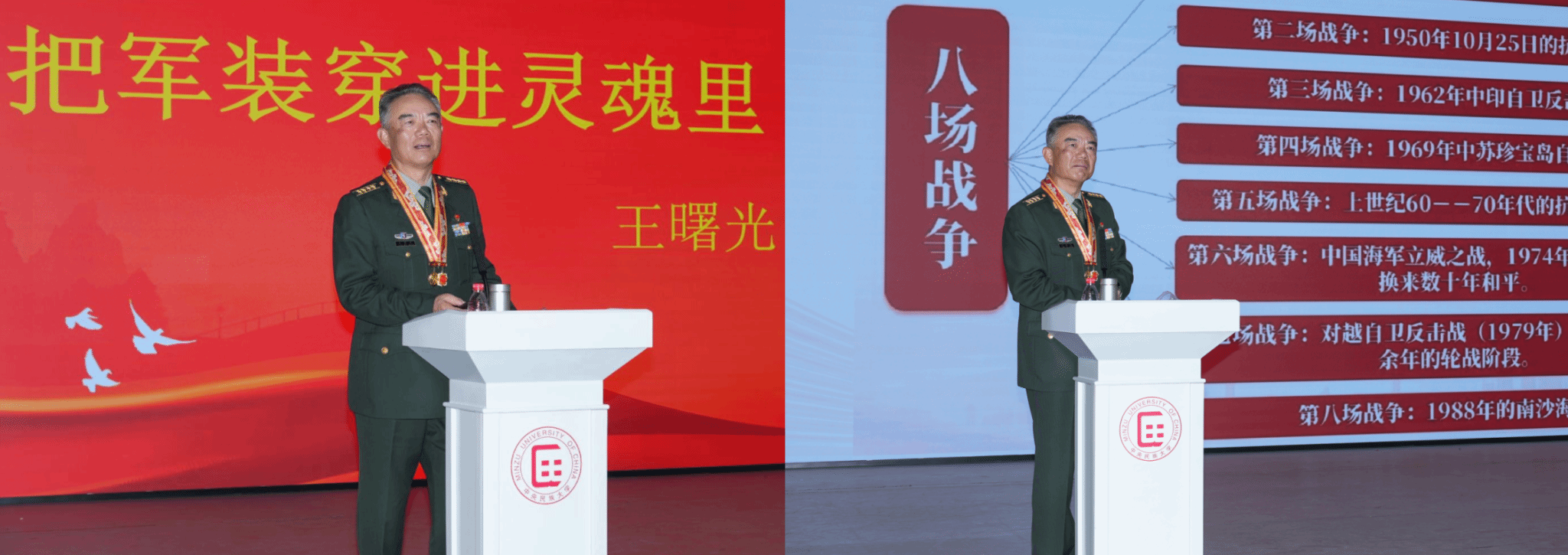 王曙光大校讲述了他在战火中经受磨砺、伤残后自强不息的故事。23岁在军校就读的他,放弃去国防大学深造的机会,主动请缨奔赴老山前线,与战士们在条件恶劣,高温、高湿、毒虫出没、空间狭小的猫耳洞中守卫祖国边疆。在一次突击作战任务中,王曙光不幸触雷,导致双腿截肢、右手中指炸断。经过多次手术与康复训练,他凭借惊人的毅力重新“站”起来,先后攻读了法律硕士与法学博士学位,并通过了律师资格考试。