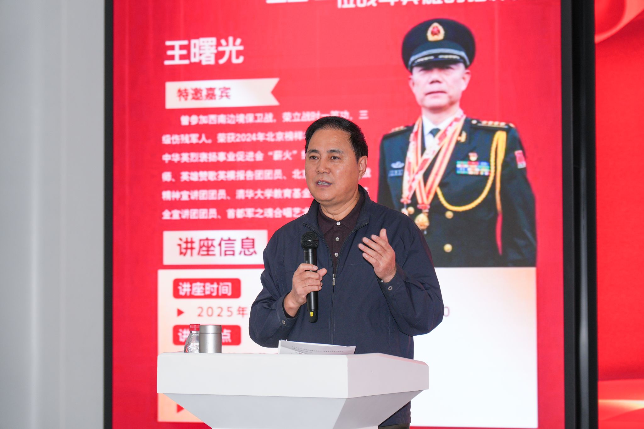 周铁海书记在开场致辞中介绍,王曙光大校曾身披戎装赴前线保家卫国,是一位“把军装穿进灵魂里”的真英雄。他希望同学们珍惜与英雄面对面交流的机会,从中汲取奋勇前行的精神动力,让青春在强国复兴中闪光!
