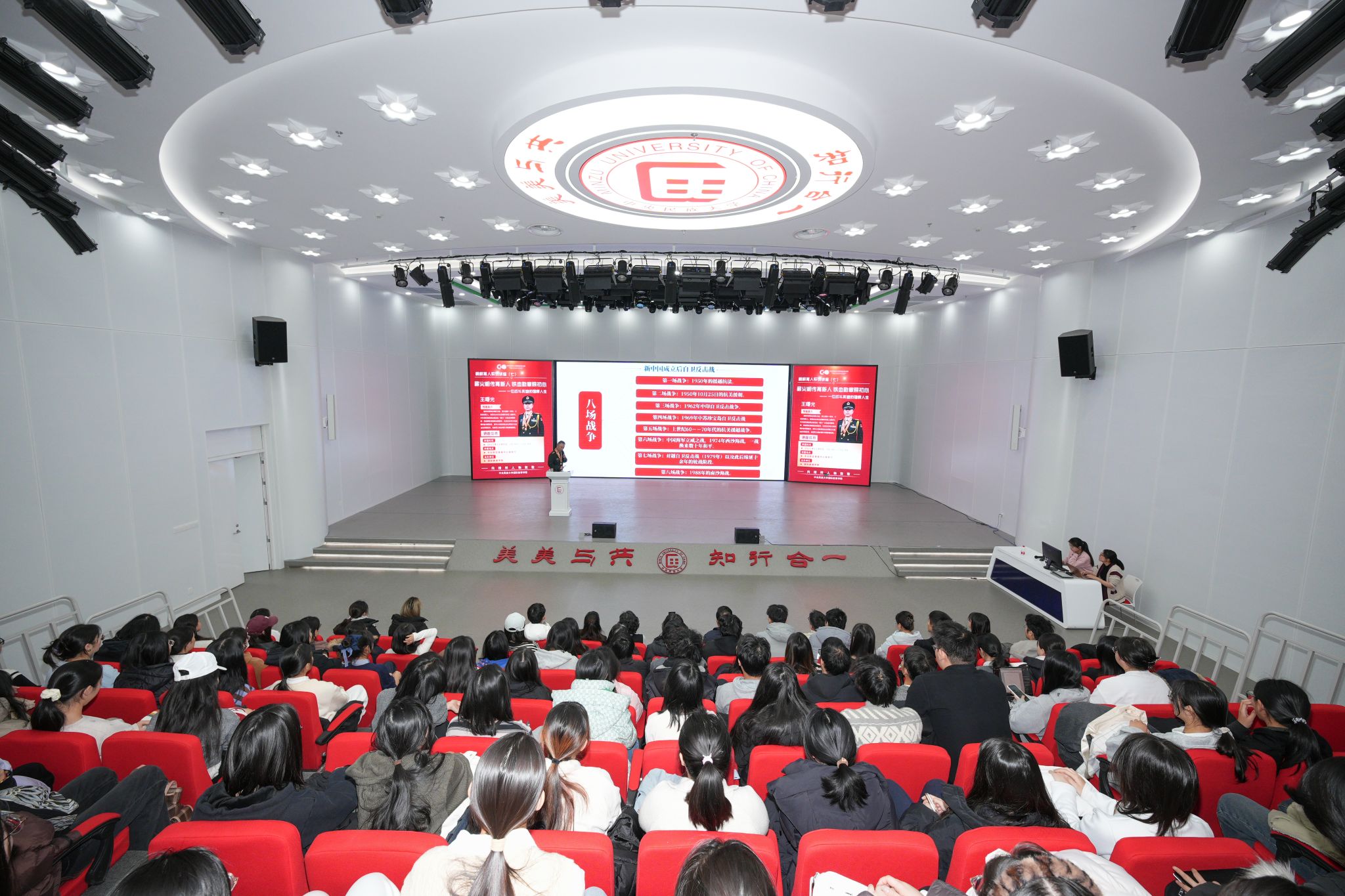 王大校的事迹告诉大家:一个普通人的坚持,可以走得很远;一颗报国心的炽热,足以照亮时代。最后,王曙光大校勉励青年学子:“付吾辈之韶华,耀吾辈之中华”,将爱国之情、报国之志转化为脚踏实地、砥砺前行的力量。