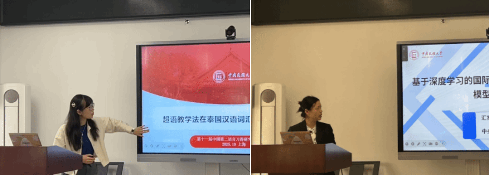 两位受学校、学院资助外出开会的教师汇报了最新研究成果。胡琬莹老师以《超语教学法在泰国汉语词汇教学中的应用》为题进行汇报。其实验研究证实,超语教学法能有效促进汉语词汇习得,效果优于单语教学并具有持续性。曾立英老师报告了《基于深度学习的国际中文教材主题层次化模型构建》。该成果为教材知识图谱构建、数字化资源建设与个性化学习路径推荐提供了新的技术思路,有助于增强主题教学中的话题拓展与实际应用能力,推动教材智能化发展。
