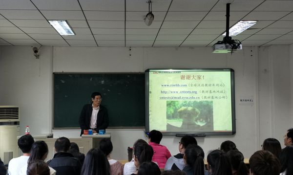 的邀请,在文华楼西区204教室举办了题为“教材库建设与教材研究”的讲座。本场讲座由张海威老师主持,吴应辉院长、多位骨干教师以及中外博士生、硕士生参加了本次讲座。