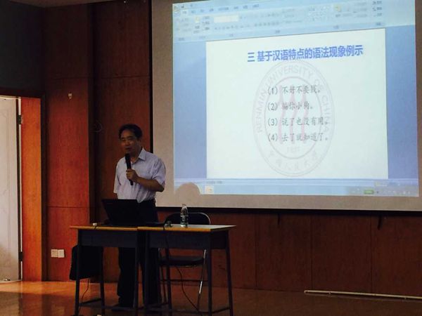 讲座中,李泉教授深入浅出地讲解和分析让听众们深刻地理解了何为“大语法学观”。他认为在汉语教学当中,应该树立“大语法观”,也就是既研究和教授体系内的语法,也研究和教授体系外语法。体系内语法和体系外语法同样重要,体系内语法教学主要集中在初中级阶段,体系外语法教学主要集中在中高级阶段。李泉教授分别从“汉语特点的语法现象例式”、“汉语书面语的语法现象例式”、“搭配和组合的语法现象历史”、“格式的语法现象例示”、“基于语篇的语法现象例式”这几个方面用鲜活而富有趣味的例子阐述了为什么我们应该树立“大语法观”的观念。比如,口语当中我们会说“骗你小狗”,对母语者来说,简单且常用,但是对于二语学习者来说,他们很难去体会这句话背后的含义。而且在中西方文化背景的差异当中,“狗”的褒贬意义是不同的。所以,二语者很容易从字面上想当然地理解。除了对“大语法“的探讨,李教授还提出了很多对教师的建议。比如,教师应该在备课环节做好充分的准备,这样不但能够从容应对学生的问题,而且能够预测学生理解上的困难更好地有针对性地教学。