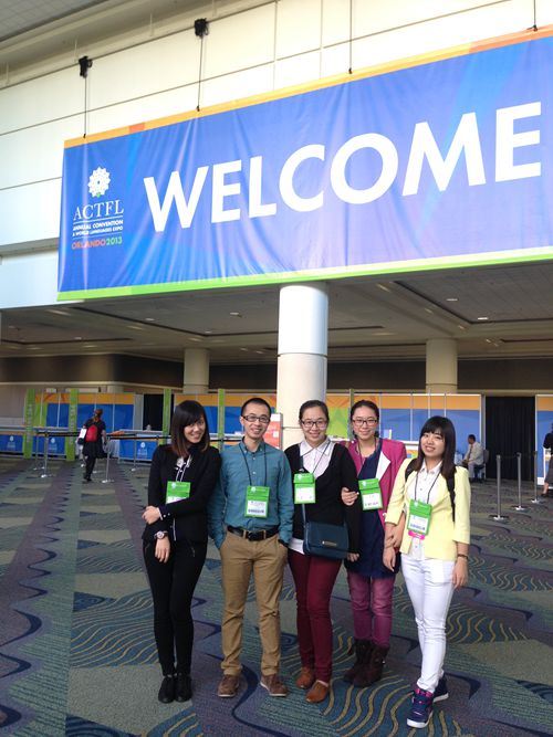 五名学生侯晓明(2010级汉语国际教育硕士,现为美国汉明顿大学全职汉语教师)、陈思(2011级汉语国际教育硕士,现在美国西东大学攻读第二个硕士学位)、张英英(2012级汉语国际教育硕士,现在美国犹他州盐湖城担任美国大学理事会中文助教)、李燕(2012级汉语国际教育硕士,现在美国汉明顿大学担任汉语教学志愿者)、吴双(2012级汉语国际教育硕士,现在美国汉明顿大学担任汉语教学志愿者),来到在美国佛罗里达州奥兰多市举行的第46届全美外语教学学会(ACTFL)年会暨世界语言博览会,积极参加各类讨论会和展览,与其他老师交流经验,互相学习,受益匪浅。