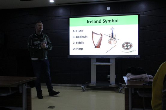 此次宣讲从爱尔兰知识小测试开始,由语言课程教师肖恩向同学们提问,并向回答正确的同学赠送小礼品,调动了现场同学的积极性,气氛十分活跃。付老师通过图片、实例和视频向同学们介绍了爱尔兰的地理环境和风土人情,使同学们对爱尔兰有了更加全面的了解。随后,付老师向同学们介绍了爱尔兰国立科克大学的学部设置、课程设置和社团活动,并展示了优美的校园风光。