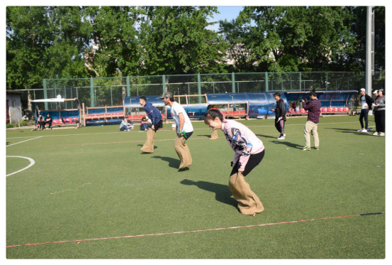 第四个游戏是袋鼠接力跳。这个游戏需要把双脚放进一个袋子里,并从场地的一端跳到另一端,最先完成接力的小组获胜。这个游戏考验的是心态,是需要速度和平衡能力的高度结合,如果太急躁,往往会不小心摔倒,或者袋子脱落。