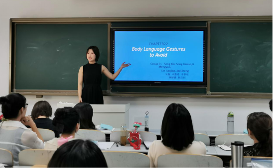 “小组读书展示”这部分锻炼了学生的英语演说能力。王教授要求学生五人一组对教材进行章节研读并用英语展示学习成果,此环节不仅增强了学生对教材的理解,实现了教材学习效率的最优化,还提高了团体协作能力和个人学习能力。此外,王教授还带同学们学习了如何快速阅读一本英文著作,抓住文章的核心内容,教学内容非常实用。