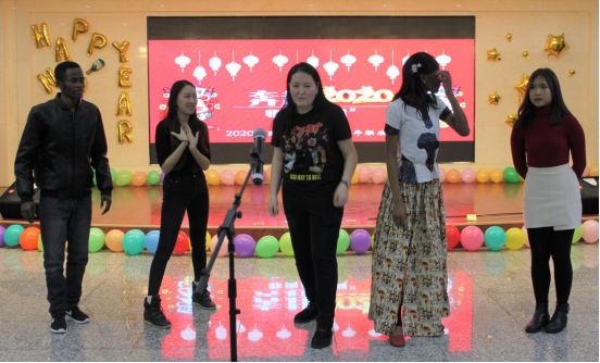 本场联欢会的第三个游戏是“少说话多做事”,参加游戏的7名同学分别需要有一个字、两个字、三个字、四个字、五个字、六个字、七个字来回答主持人的问题,可以说这轮游戏是大脑反映速度的比拼。游戏结束后,来自九个国家的九名同学,身着九种不同的民族服饰,一起为我们带来了多语种歌曲《Hello,Stranger!》。