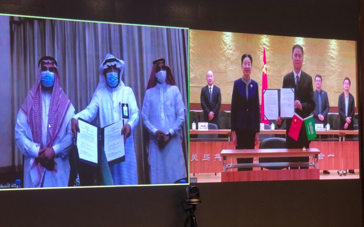 党总支书记周铁海和阿卜杜勒·阿齐兹国王大学学生事务部主任Masoud Al-Qahtani共同签署了合作协议文本。