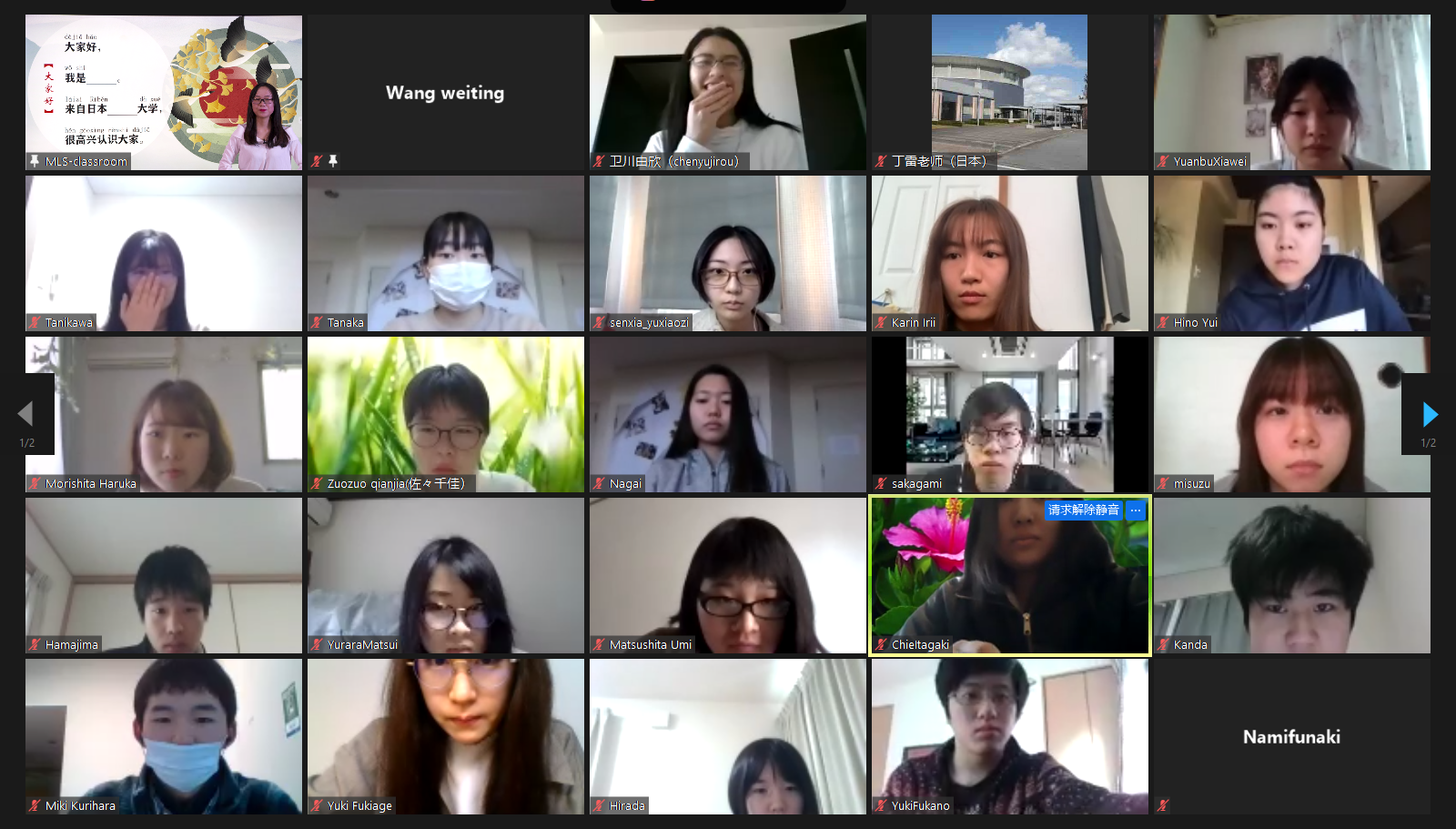 仪式开始,项目组教学主管谷陵老师首先用一句日语问候拉近了彼此的距离。随后,谷老师详细地介绍了该项目文化体验课程设计,邀请同学们和老师一起逛一逛古老而现代化的北京城,聊一聊中国大学生喜欢做些什么,去年轻人最喜欢的地方打打卡,再看一看中国人有多么喜欢网购。她嘱咐同学们尽快熟悉线上学习环境,积极和老师互动,在体验文化的同时学习汉语听说。谷老师还向同学们介绍了每节课程的主讲老师。主讲老师们一一亮相,热情地和同学们打招呼。