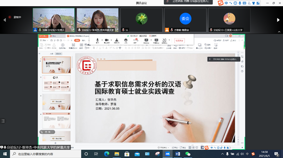 在分论坛“汉语教师师资培养和专业发展研究”中,张华杰同学报告了《基于求职信息需求分析的汉语国际教育硕士就业实践调查》,指导教师为罗莲老师,该研究聚焦于汉语国际教育硕士的求职信息需求,设计并发放求职信息需求调查问卷260份,分析发现汉语国际教育硕士的国外长期求职意向不高,而从事国外短期汉语教学和国内工作,且对各方面的求职信息存在普遍较高的需求,其中行业相关信息需求居于首位。该论文获论坛优秀论文评选三等奖。
