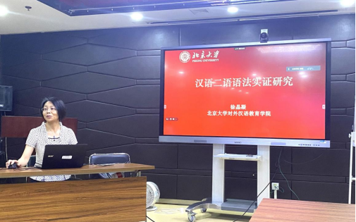 徐教授首先以“语法教学是否必要”这一学界争议颇多的问题开启了本次讲座,随后围绕“语法教学应该是显性的还是隐性的”这一问题,详细介绍了主张显性教学的几个逻辑、相关实证研究方法等。徐教授以两个研究为例,分别探讨了显隐性教学对比实证研究和语料库研究的开展。徐教授还分享她对学科发展的反思和观点,最后徐教授与在场师生就语法偏误研究、汉硕生就业等问题展开了热烈讨论。