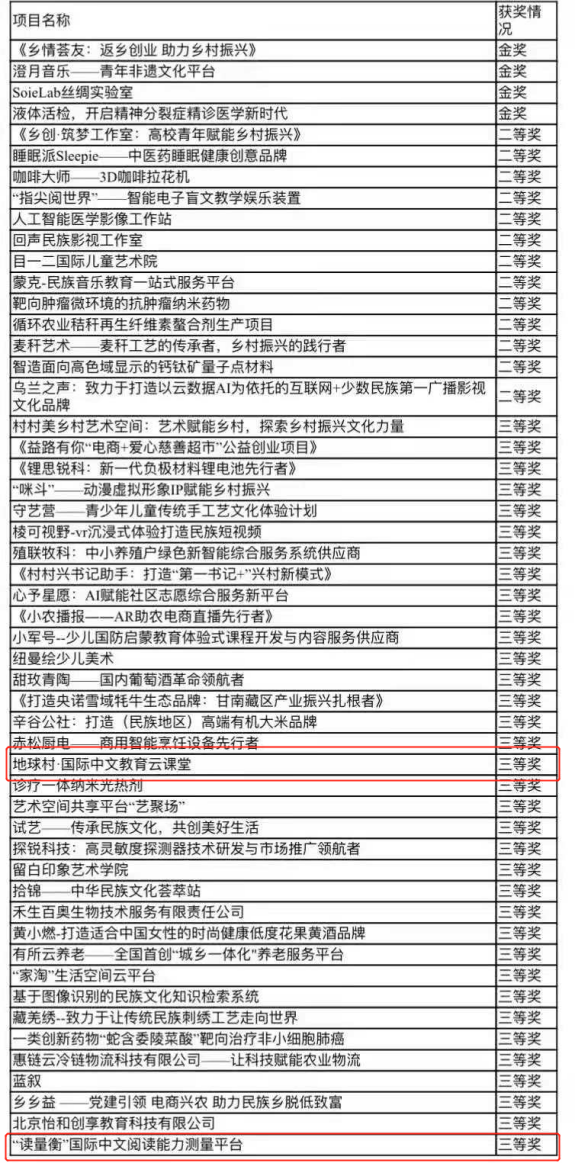 的“地球村·国际中文教育云课堂”项目和“‘读量衡’国际中文阅读能力测量平台”项目喜获北京赛区三等奖。