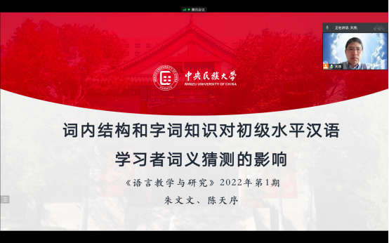 陈天序副教授以《词内结构和字词知识对初级水平汉语学习者词义猜测的影响》为题目进行了交流。陈天序副教授的研究以74名在京留学生为研究对象,进行了“汉字知识”、“词汇知识”及“词义猜测”等测试,对测试结果进行了统计分析。研究结果发现词内结构显著影响汉语二语的词义猜测,偏正结构类词语比并列结构和动宾结构更容易进行词义猜测,学习者的字词知识与词内结构对第二语言词义猜测有交互影响。交流结束后陈天序副教授与参会人员展开讨论,并对曾立英教授和罗莲副教授提出的问题进行回答。