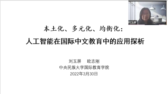 刘玉屏教授以《本土化、多元化、均衡化:人工智能在国际中文教育中的应用探析》为题进行了主题报告。刘玉屏教授首先指出了当前国际中文教育“三化”的问题(本土化、多元化、均衡化),对人工智能解决“三化”问题进行了理论分析,并探析了解决具体问题的实施路径,最后从宏观层面论述了人工智能应用于国际中文教育的挑战与对策。谷陵老师就人工智能的应用以及相关技术问题与刘玉屏教授及参会人员展开了讨论。