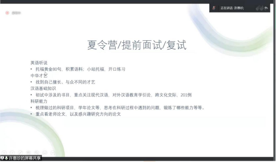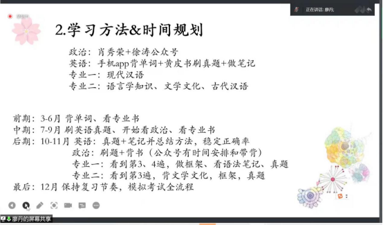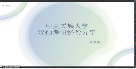 考研至本校本专业的许惠珍同学结合自身情况,从民大汉硕考情、择校择专业建议、考试内容及参考资料以及复习规划和建议等方面为同学们详细介绍了本专业考研相关情况。分享中,许惠珍向同学们提道:“在复习中,复盘是十分重要的,不要存在侥幸心理。”随后,又详细介绍了相关复习方法以及时间规划,并提醒同学们要学会甄别各式各类的信息。最后,许惠珍向同学们送去了最衷心的祝福和鼓励。