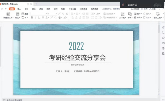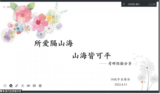 活动于2022年4月15日晚19时通过腾讯会议线上展开,参会人数为35人,包括全体2019级本科生、部分2021级本科生以及2019级班主任余烁老师、本科生辅导员李雅洁老师。本次考研经验分享会由本科生辅导员李雅洁老师主持,三位优秀的2018级应届毕业生分享了自己考研的宝贵经验,分享结束后,同学们踊跃发言,提出自己的疑惑,三位应届毕业生也给予了耐心的解答。