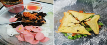 2019级本科生苟玉林:虽然在学校没法开火做菜,但是也可以做其他宿舍版“美食”。首先第一位上场的是拥有火辣身材的“老干妈香肠拌饭”。从食堂打包3毛钱的白米饭,加上两勺超市买的老干妈,最后再来根火腿肠!完美!进嘴的那一刻,老干妈的火辣瞬间充斥口腔,犹如千万只细小的蚂蚁啃食着嘴唇的每一个细胞,嘴唇在不断的变大变肿…好叭,其实是老干妈放多了,太辣了。接下来迎面向我们走来的是“宿舍版辣条三明治”选手。两片全麦面包,减脂期必备,夹上生菜、鸡蛋、黄瓜和辣条,最后撒上秘制沙拉酱就完成了!鉴于之前老干妈的教训,这次只放了两根辣条。大嘴咬下,哇哦~真的很美味!辣条的咸香和生菜黄瓜的清爽,配上淡淡的面包香…吃完还想再来一个!在这次动手做美食的过程中也感受到了做饭的不易。饭前得准备食材,饭后得清理厨具、食物残渣等,真的是一件很繁琐的事情。不由想到父母给我们做了二十多年的饭,真的很辛苦,有时候我还挑嘴,实在不应该。以后要好好珍惜别人的劳动成果和粮食呀!