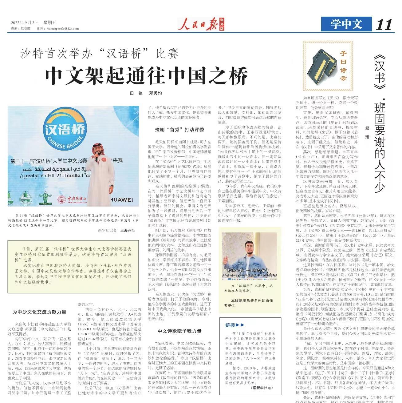 教师田艳、邓秀均在《人民日报海外版》撰文,讲述了此次汉语桥比赛的获奖学生张云飞、毛天佑、王索丽学习中文的动人故事。