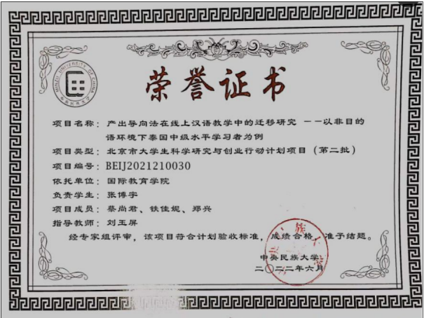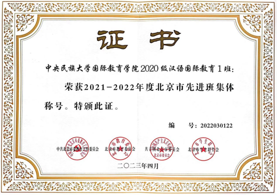 在2021-2022年度评选中,2020级汉语国际教育1班荣获北京市“先进班集体”荣誉称号。