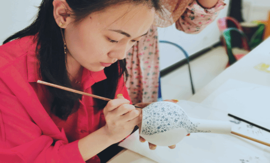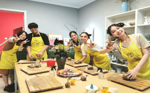 陶瓷是中华民族对世界文明的重要贡献,中国因此也拥有“瓷国”的美称。开心国艺术工作室一件件精致的陶瓷文物,仿佛穿越古老时光,携带着一代代手艺人的匠心来到我们眼前。精美绝伦的釉下五彩,精湛的技艺、优良的品质、独特的工艺,悠久的文化,让留学生们赞叹不已,纷纷拿起手机合影留念。本次的沉浸式教学的高潮出现在DIY陶吧区。陶艺师向留学生介绍示范了手拉坯、彩绘的基础知识和操作手法后,每一位留学生获得了“一显身手”的好机会。留学生们在陶瓷专业教师的指导下,饶有兴致地学习拉坯、泥条盘筑、泥板成型等基本陶瓷成型技艺。他们充分发挥自己的想象力和创作力,运用搓、揉、拍、捏等手法,即兴创作出了寓意丰富、形式多样的陶艺作品,以此诠释他们对艺术作品的美学追求和对中华优秀传统文化的由衷热爱。