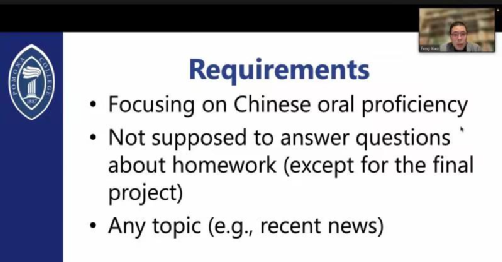在活动正式开始前,来自Pomona College的肖峰老师召开线上会议为同学们讲解了本次中文辅导活动的相关要求。辅导期间,同学们需同各自的语伴通过Zoom或微信进行不少于10次的见面,每次时长为40分钟,包括英文与中文交流。活动结束后,同学们需根据相关评估要求为语伴们的口语表达能力打分。
