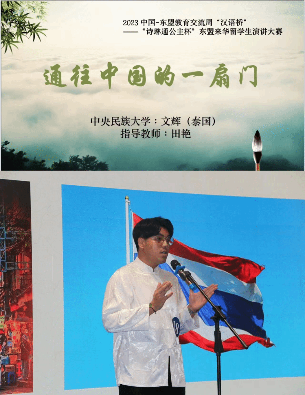 文辉同学演讲的题目为《通往中国的一扇门》。他将汉语和文化比喻为通往中国的门 , 以饱满的表现力和充沛的感情讲述了自己在学习中文的道路上与中国的美好情缘。他讲道:“我并非华裔,是纯粹的泰国人,家族中也没有人会讲中文,但我对中国始终充满了热爱。回首来时的路,虽然有些坎坷,虽然充满困难,但是那扇通往中国的门,始终激励我不断学习,不断成长 ! 推开那扇门,前面是更加光明、美好的未来!”