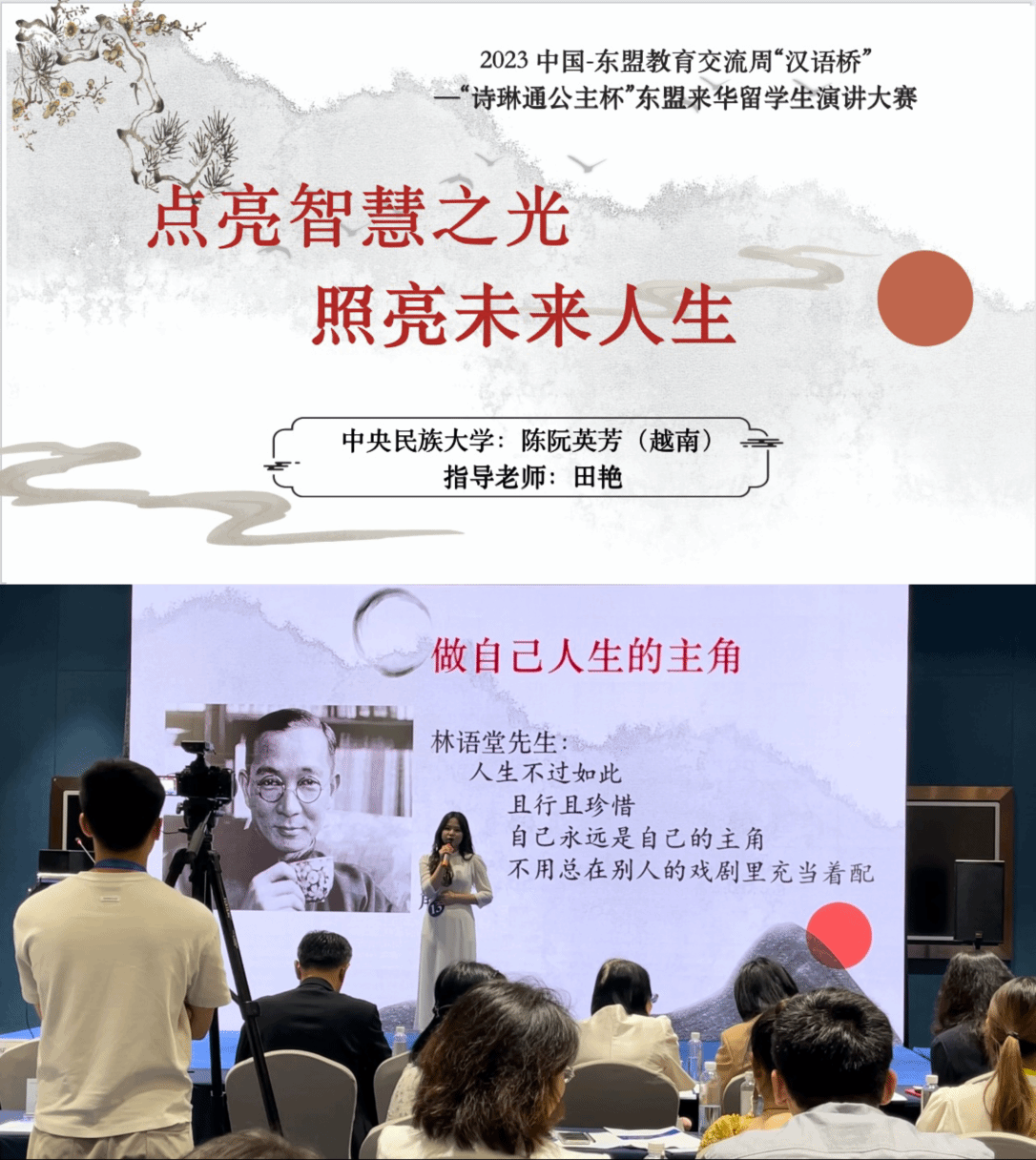 陈阮英芳同学演讲的题目为《点亮智慧之光,照亮未来人生》。她以生动的语言讲述了自己从7岁与中国初遇以及成长中每一个重要的时刻,都有中国名人典故给予她人生启迪的故事。在演讲的最后她说道:“中国带领我前行,见证我成长。中国为我点亮智慧之光,也照亮了我未来的人生。一世情缘,愿一生相伴!”