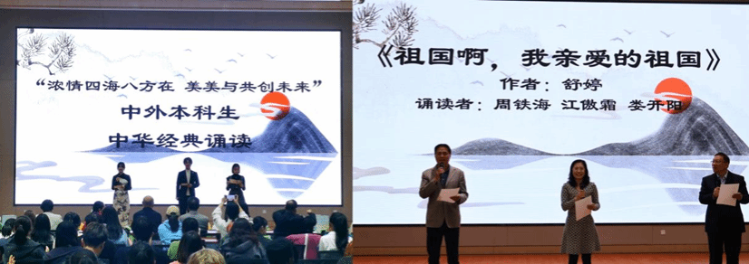 在丰台校区明德楼报告厅举办“浓情四海八方在,美美与共创未来”中外本科生经典诵读暨学生交流活动。