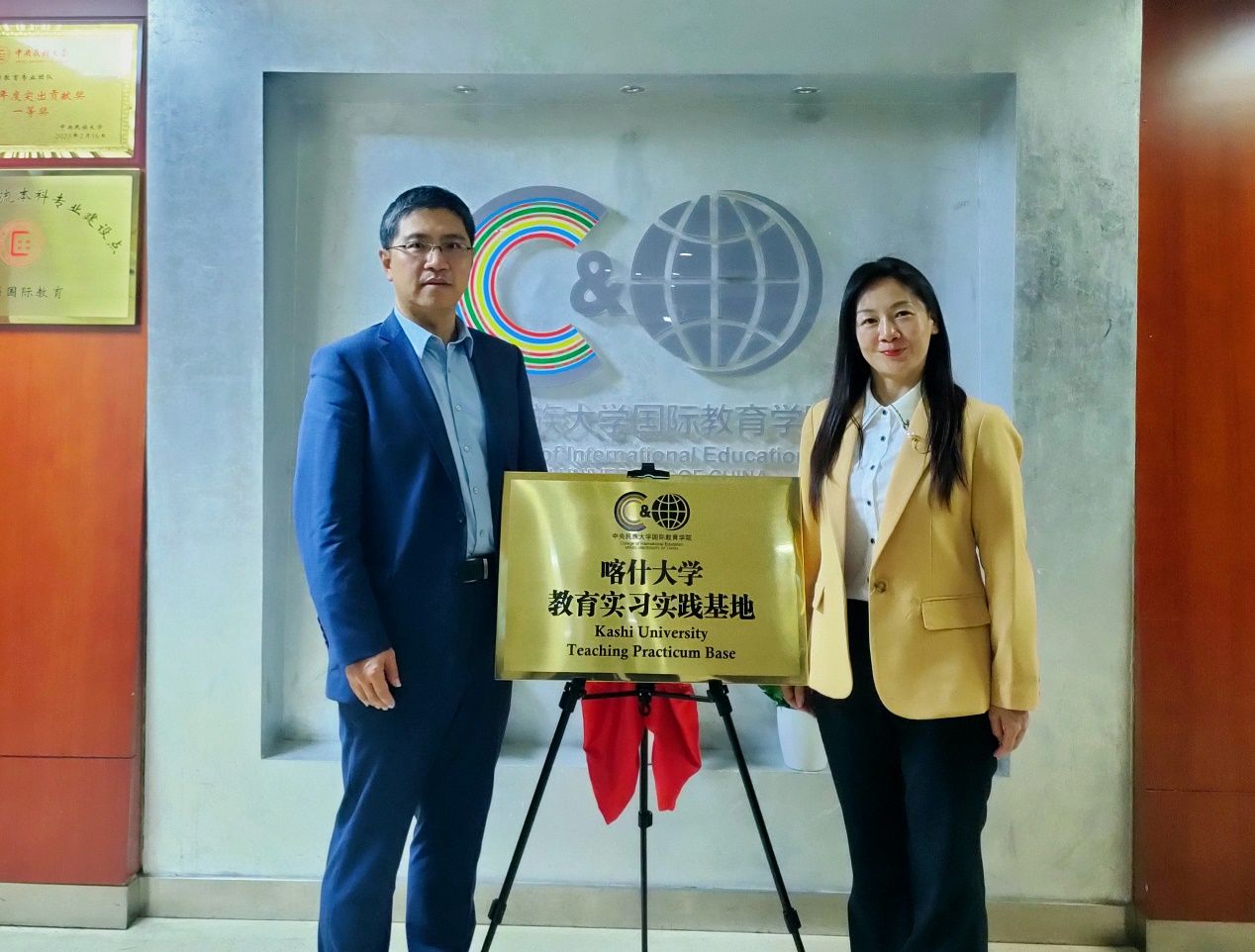院长陈天序,新疆喀什大学人文学院党委副书记林青代表双方学院签署合作协议并为教育实习实践基地揭牌,相关工作人员参加仪式。