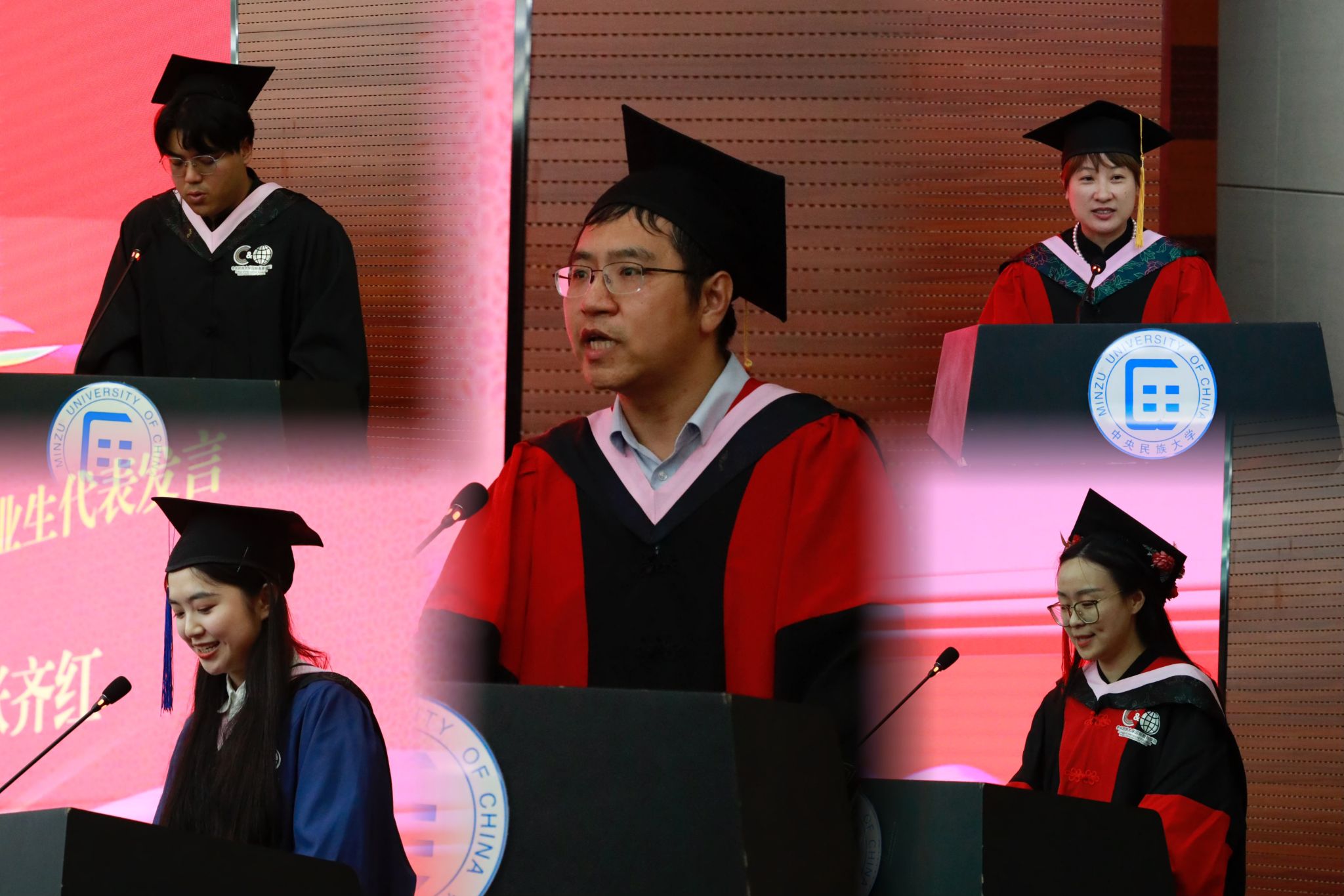 曾荣获学校十佳大学生的张齐红代表硕士毕业生发言。学院的培养塑造了自己胸怀全球的视野和格局、开拓创新的精神和无惧挑战的勇气,她和她的同学们求学和实践的足迹遍布世界各个角落。美国、英国、爱尔兰等国家都留下民大国教人的身影。张齐红代表全体毕业生庄严承诺:民大国教人将秉持中国情怀、世界眼光。天南海北,我们不会忘记来时的路。山高路远,我们会奔向更好的远方。