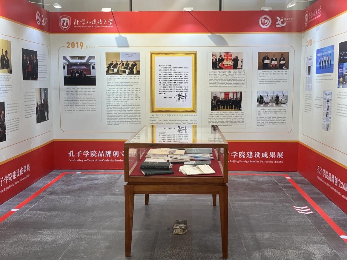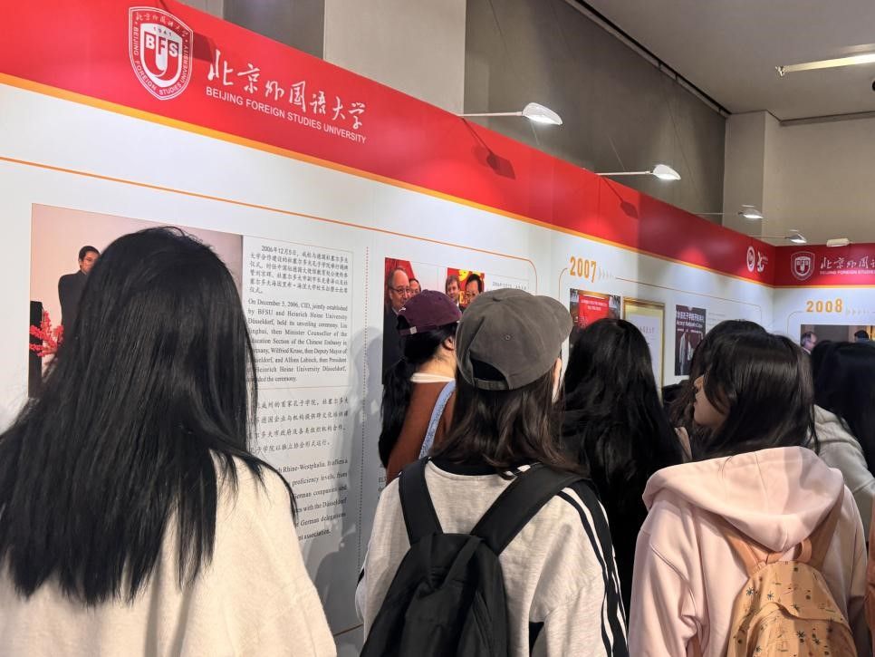 抵达北京外国语大学后,同学们首先参观了在北外图书馆一楼举办的孔子学院建设成果展。展览通过丰富的文字、图片和实物资料,生动展示了孔子学院创立20年来的发展历程。从最初的几个试点到现在的全球布局,孔子学院不仅成为了推广中文教育的重要平台,也成为了增进中外友谊、促进文化交流的重要桥梁。