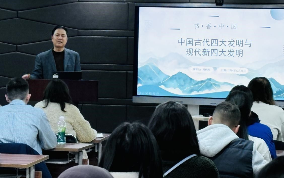 党委书记周铁海在学院报告厅为全校近百名留学生作题为“中国古代四大发明与现代新四大发明”的中国国情教育讲座。此次讲座以科技创新为切入点,向国际学生展示中国灿烂的历史文化和当代科技的创新成就,增进留学生对中国国情的理解和认同。