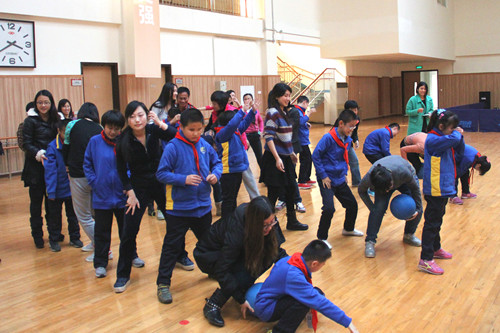 和盲人学生双人跳绳,对我们每一个人来说都是一次不小的挑战。一个带一个,刚一开始总是不能协调如一,但是在盲校老师的指导下。我们喊着口号,慢慢地找到了诀窍。一分钟记时,甚至有一组在一分钟跳了117个,这样的成绩也创下了盲校的记录。我们为之欢呼和感动,其后的传球接龙,蜗牛赛跑都是团体合作项目。尤其蜗牛赛跑。前一个人要抓住后一个人的脚踝,大家坐在地上,喊着口号共同前进。虽然在和盲人学生的合作中有所不便,但最重要的是我们能换位思考,用他们的心再次体会这个世界。这个世界也许不是由色彩足够,但是感动可触。我想这该是敬畏生命的过程。