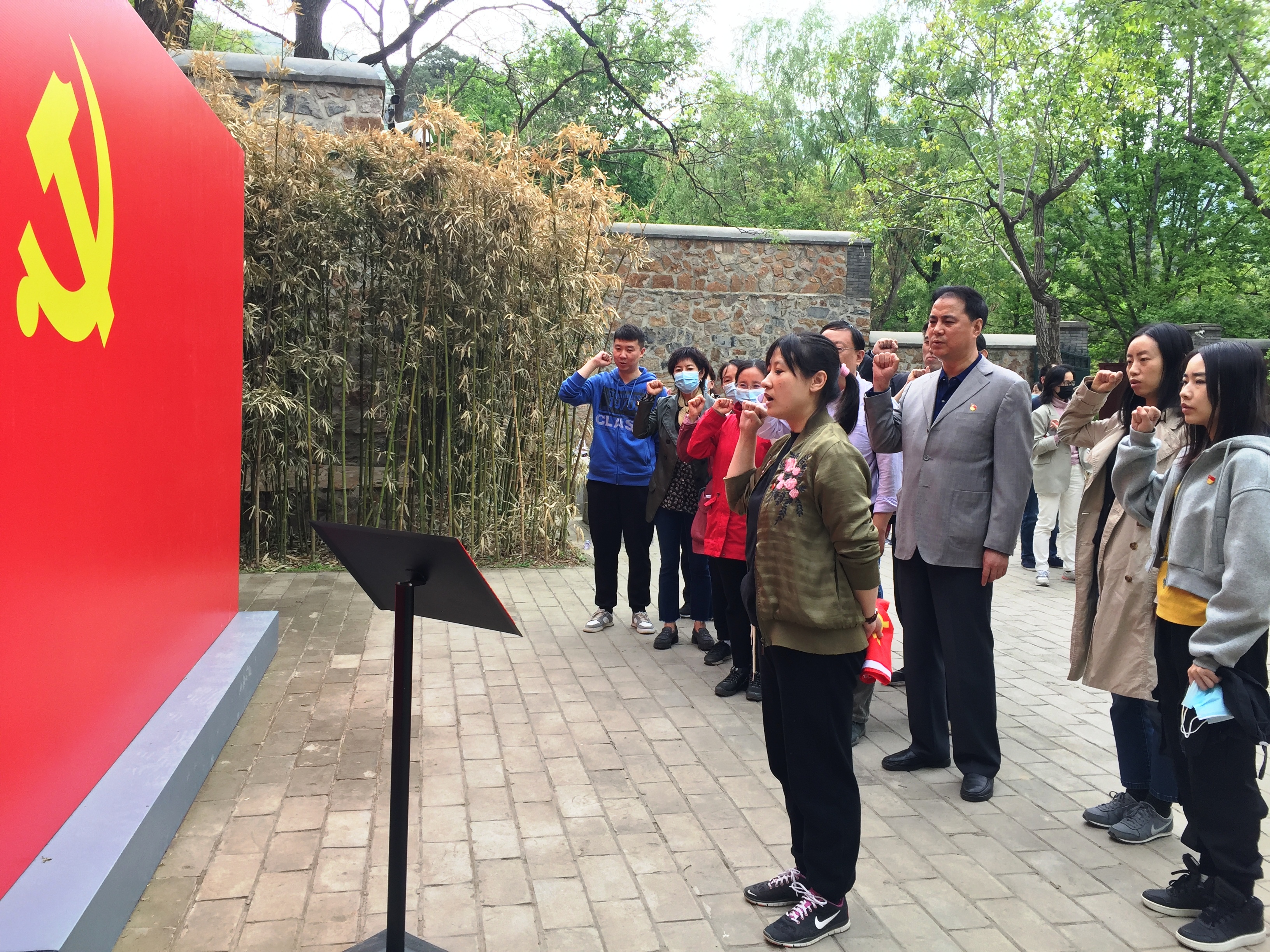 在双清别墅东侧平房,由党支部书记谷陵同志领誓,党员同志们面对鲜红的党旗,紧握右拳、高举手臂,庄严地重温了入党誓词。同志们以铿锵有力的宣誓声,表达不忘初心、牢记使命的坚定决心,通过重温入党誓词,再一次接受了入党衷心的洗礼,深深体会到作为一名共产党员的责任感和使命感 。