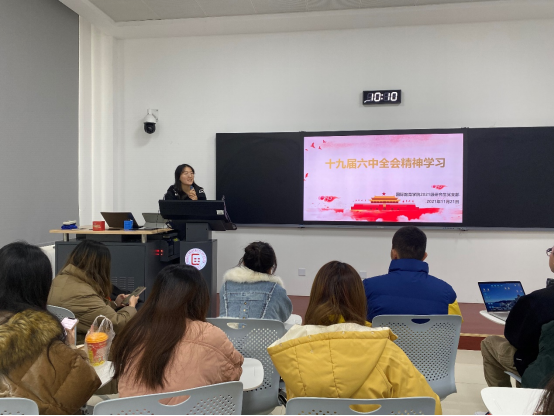 2021级研究生党支部于明德楼122教室召开了以学习十九届六中全会精神为主题的会议。支部成员深入领会党的百年奋斗重大成就和历史经验,并展开了热烈讨论。本次会议由2021级研究生党支部书记王梦月同志主持,共有22名党员通过线上、线下的方式参与会议。