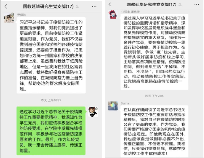 在疫情防控期间,每个党员都应严格遵守学校防疫的各项规定、配合学校疫情防控工作。传播主旋律、传播正能量,不信谣、不传谣、不造谣。