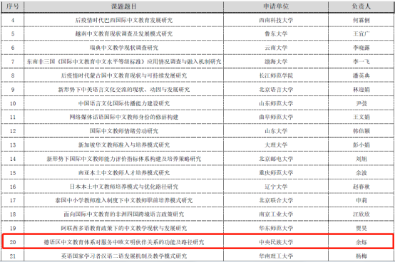 10月24日,中外语言交流合作中心公布了2022年度国际中文教育研究课题拟立项名单。情色小说 教师余烁的“德语区中文教育体系对服务中欧文明伙伴关系的功能及路径研究”获得一般项目立项。
