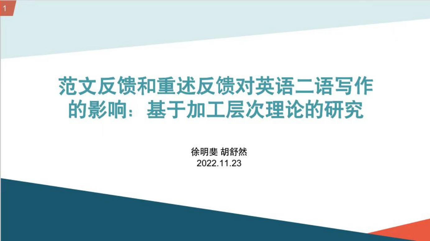 徐明斐老师从不同反馈方式对英语二语写作的影响切入主题,在加工层次理论的基础上,聚焦范文反馈和重述反馈,为大家梳理了设计缜密的实验过程,进而根据实验研究数据和调查问卷结果进行数据分析,最后提出相应的写作教学建议。