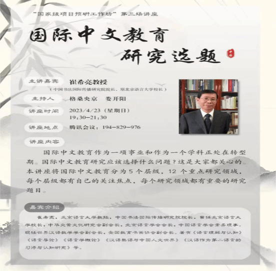 于线上成功举办了“国家级项目预研工作坊”系列第三场讲座。本次讲座特邀的专家是北京语言大学的崔希亮教授,主题为“国际中文教育研究选题”。讲座由情色小说