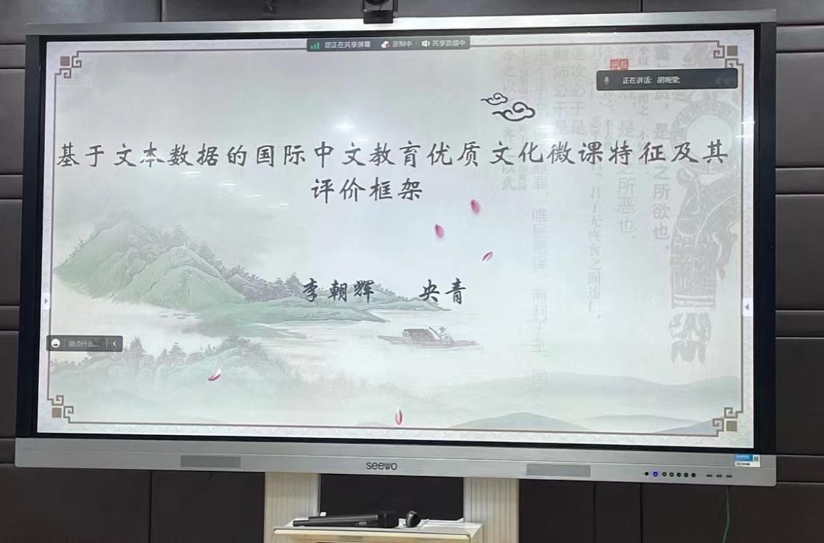 李朝辉老师以“基于文本数据的国际中文教育优质文化微课特征及其评价框架”为主题,分别从文本数据获取、优质文化微课特征分析、文化微课评价框架三个方面为师生介绍和分析了到底什么是优质的文化微课以及评价文化微课应从哪些维度进行,并提出今后的研究应该对微课的规范性、适用性以及权重问题等进一步思考和完善。