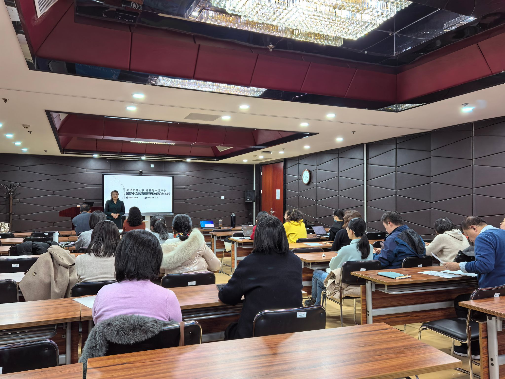 在海淀校区报告厅举办“讲好中国故事·传播好中国声音:国际中文教育课程思政理论与实践”专题讲座。学院邀请北京语言大学沈庶英教授就如何将思政教育融入国际中文教育课程与学院教师进行了深入的探讨和交流。讲座由江傲霜副院长主持,学院全体教师参加了本次讲座。